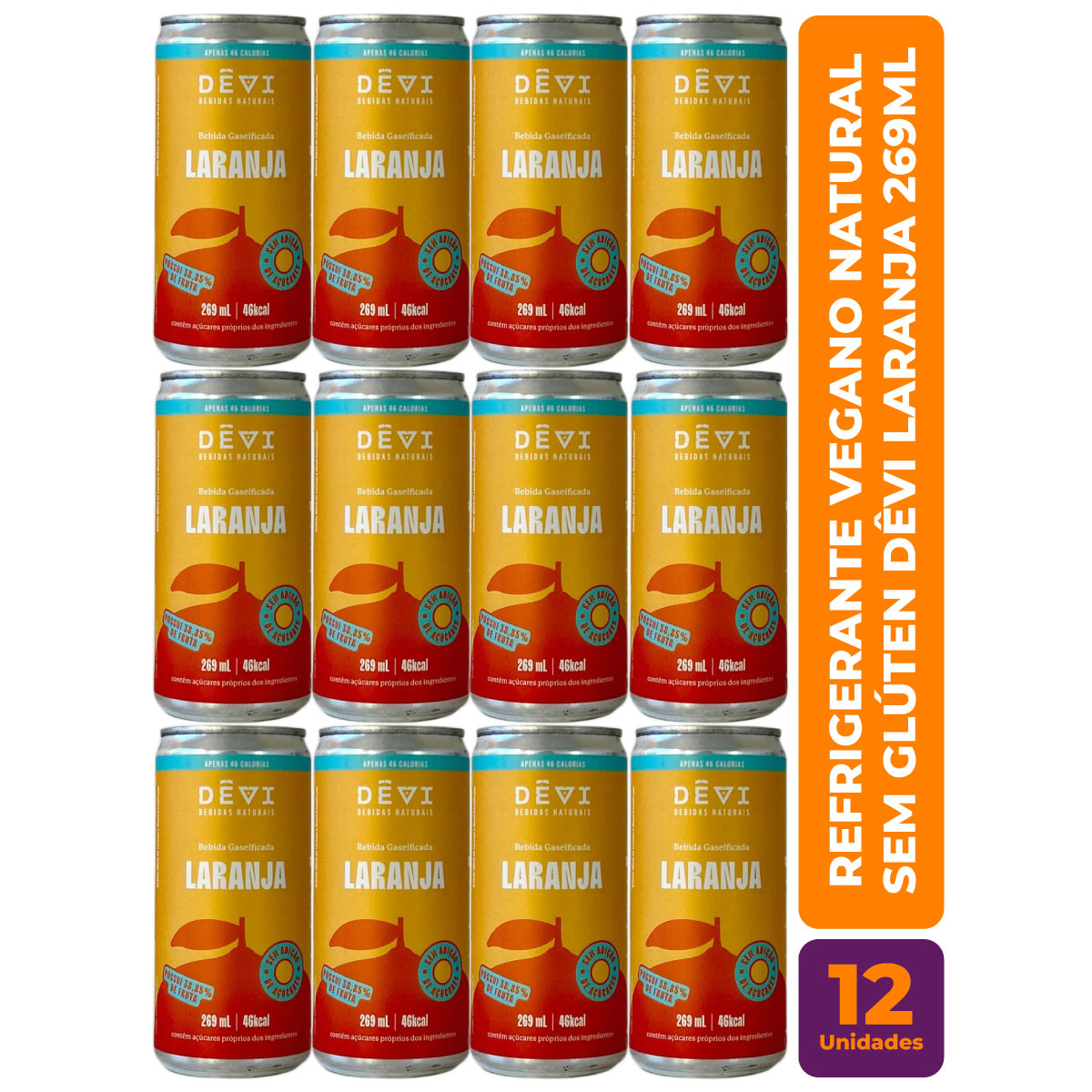 R$8,49 CADA UN - Pack com 12 Refrigerantes Vegano Natural DÊVI Laranja 269ml